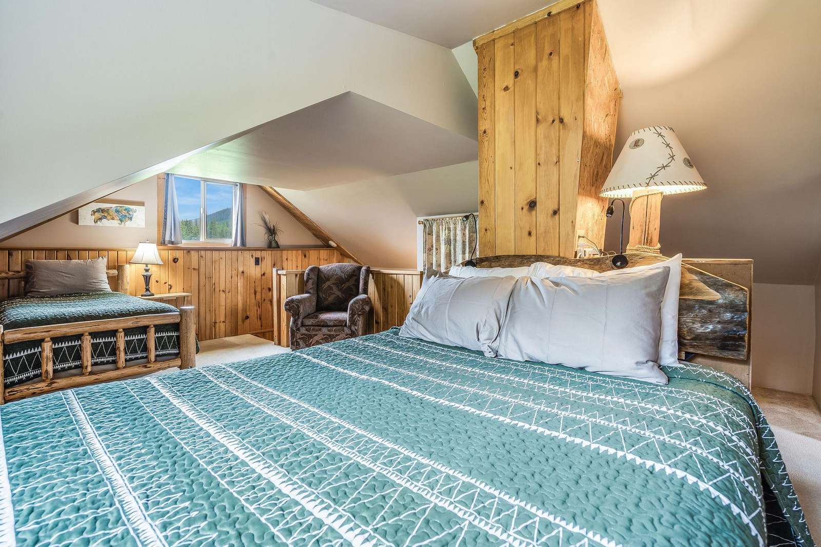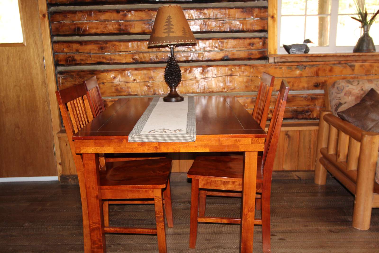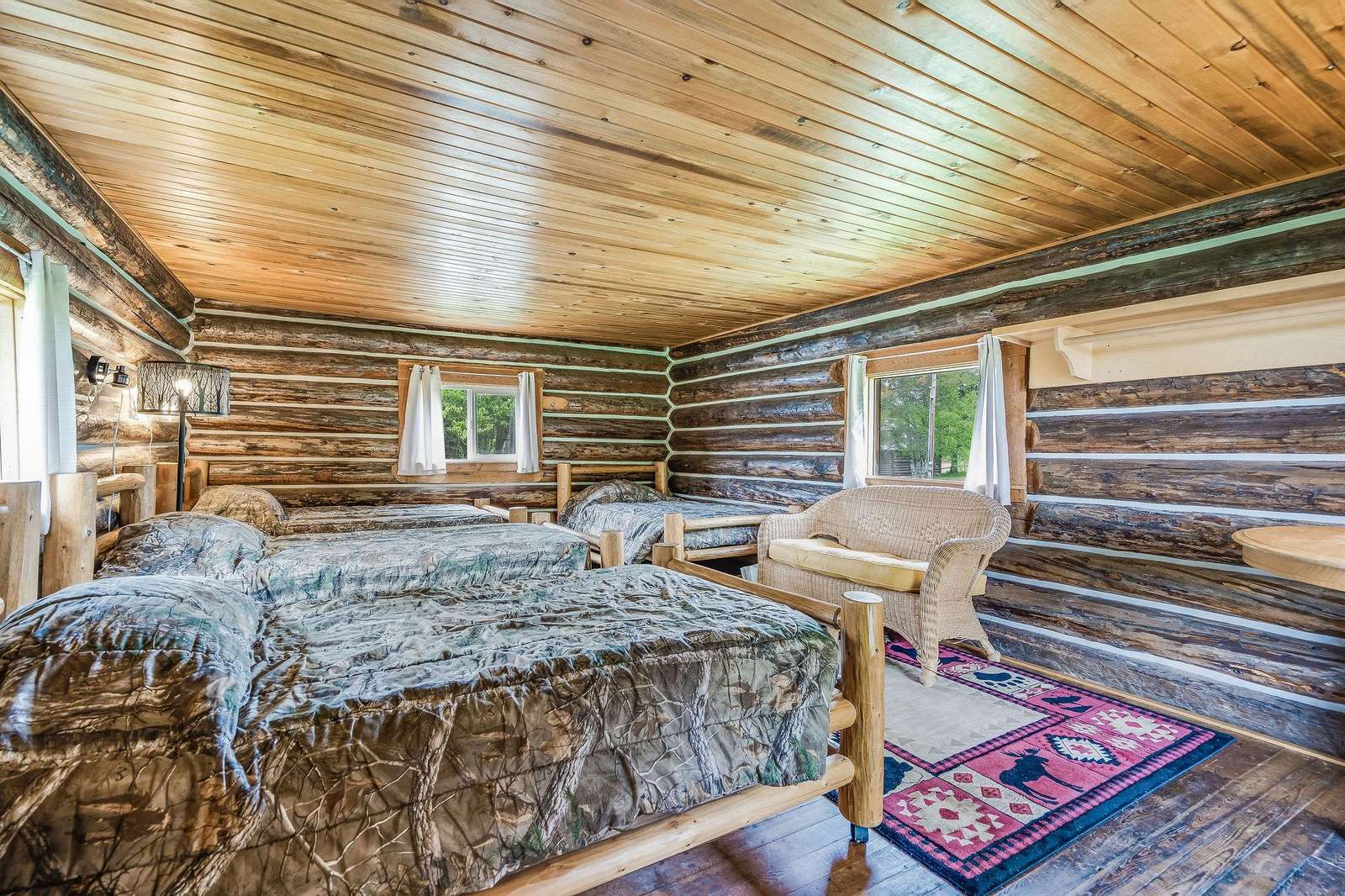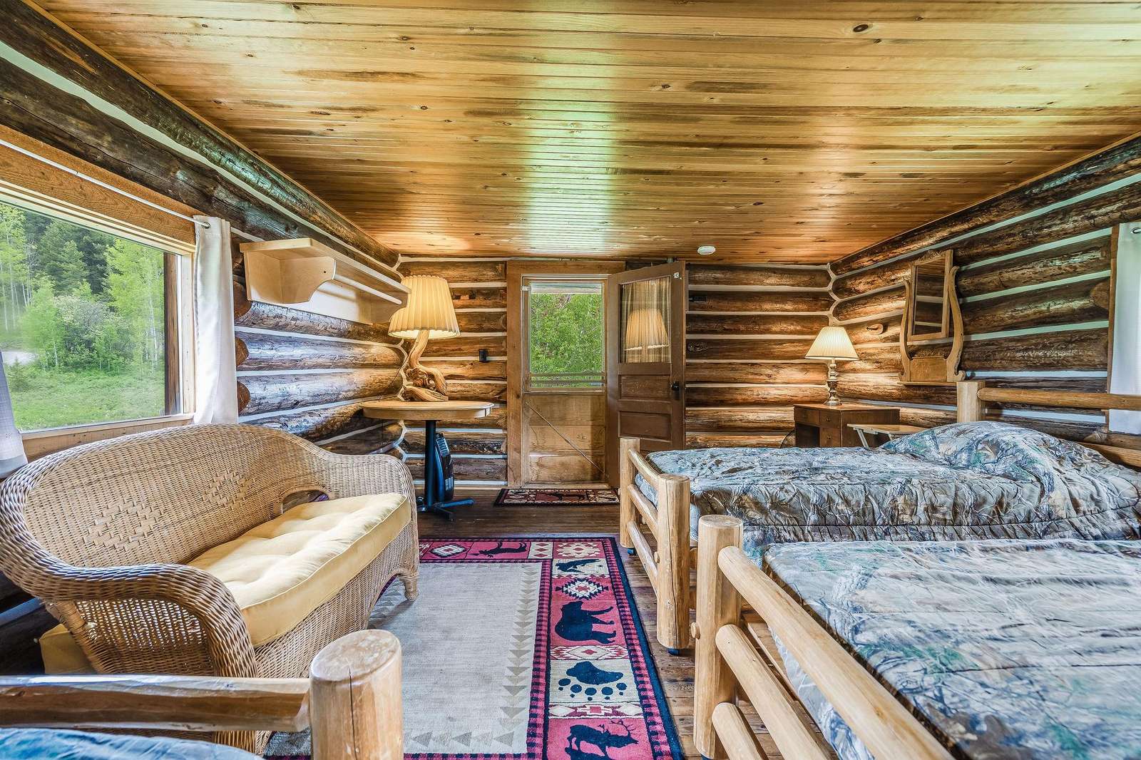 Adjacent to Mickey's is the Bunkhouse. This small cabin was used as a pelting shed by Mickey and other trappers. It has been converted into a bunkhouse which can be rented in conjunction with Mickey's. With four single log post beds and located next to the main house, this is a perfect place for the kids or extra guests. This cabin is reserved for guests of Mickey's.