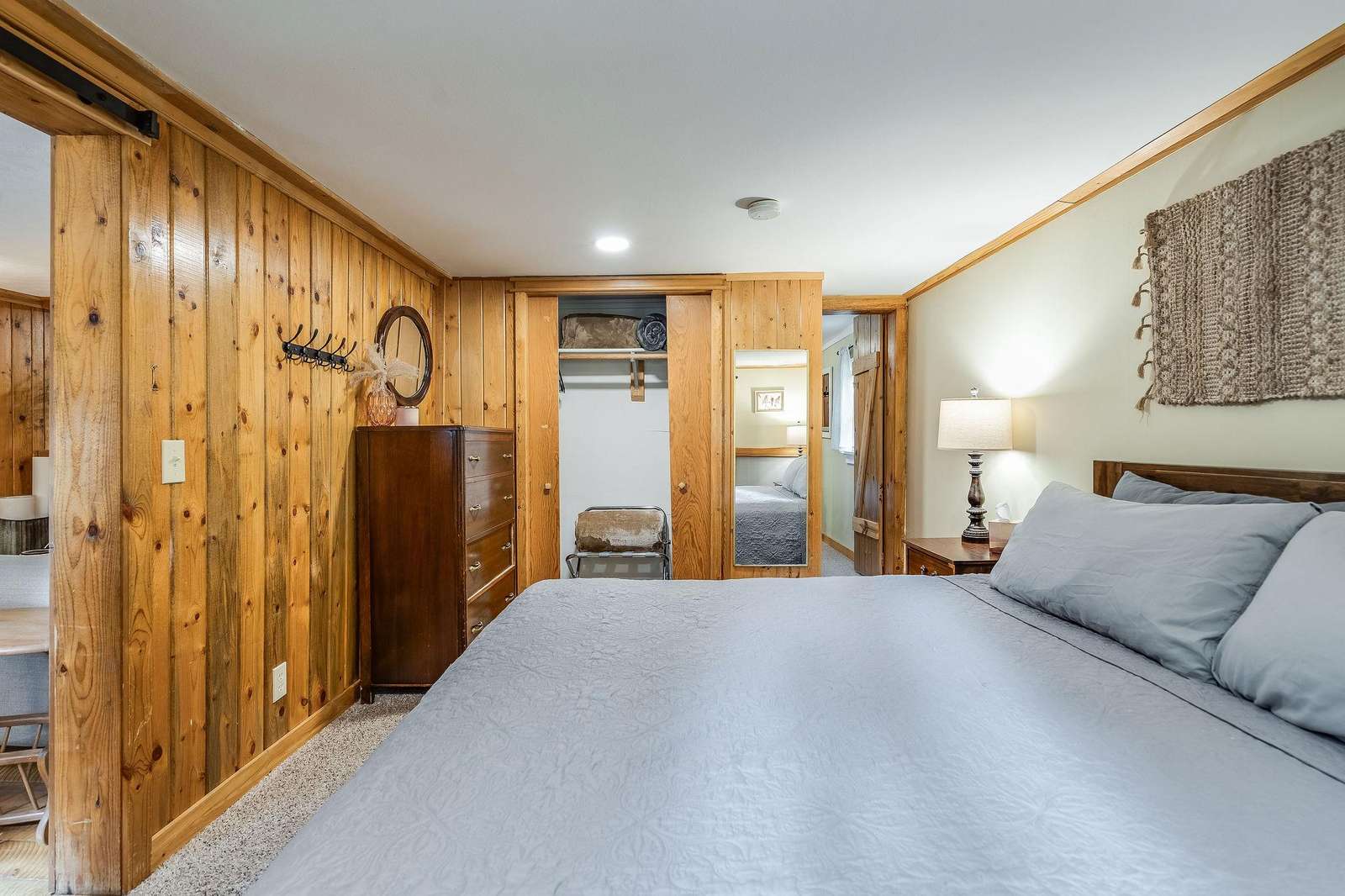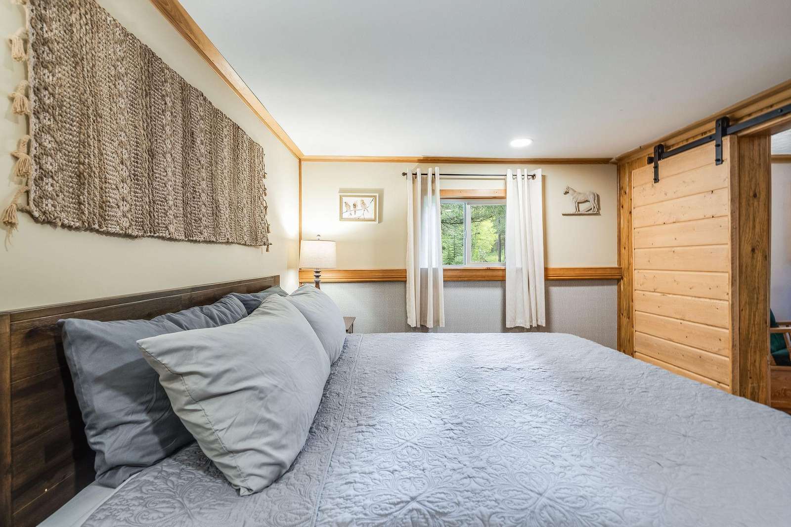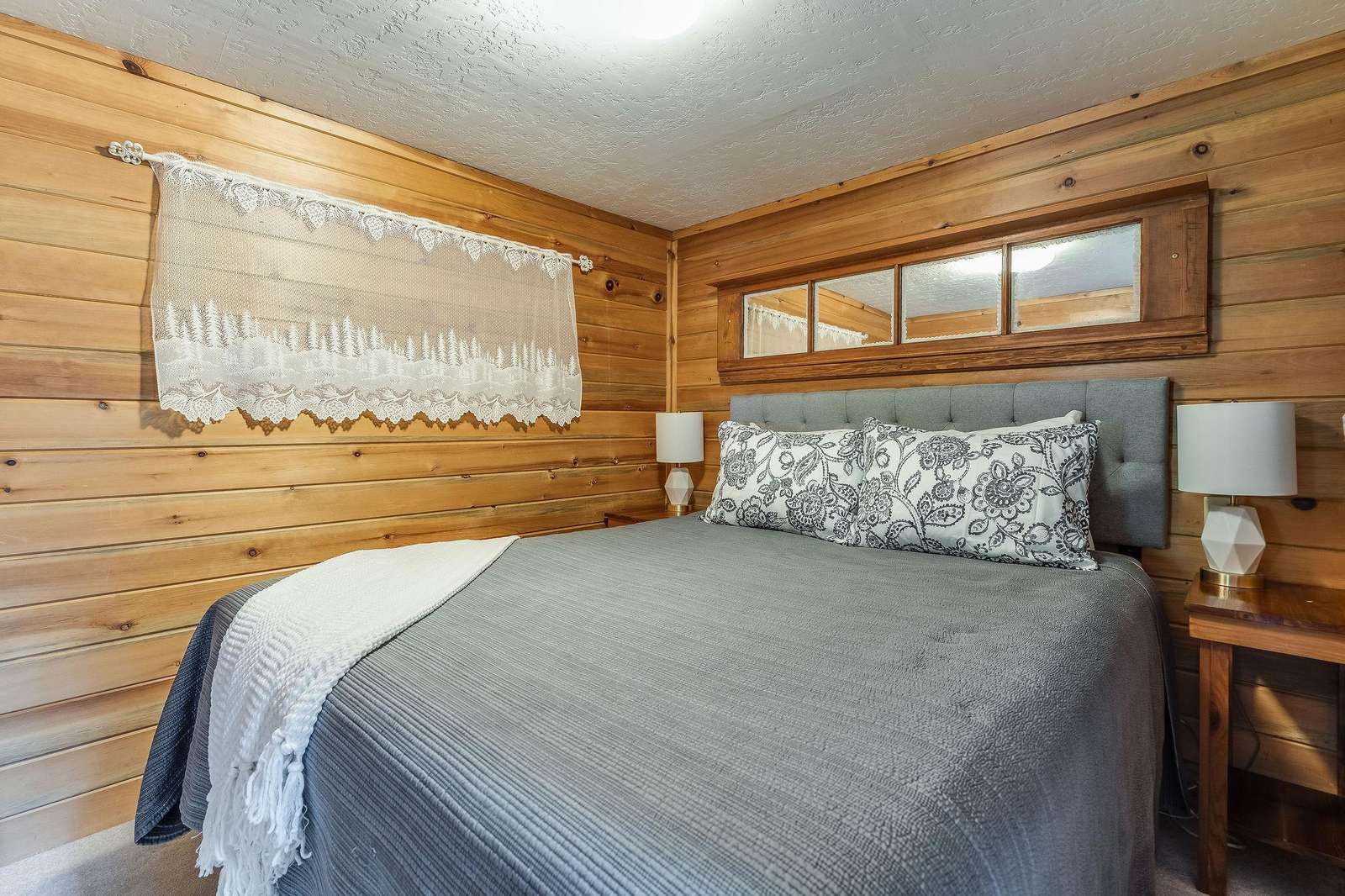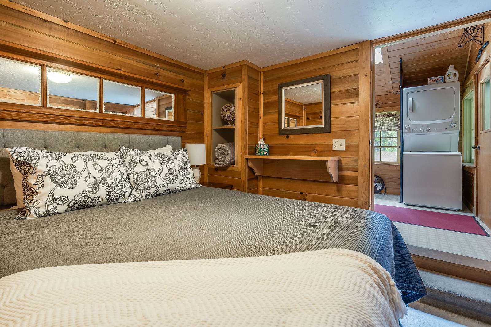 Quin has a master bedroom with a king, a second bedroom with a full bed and one small bonus room next to the master with a single bed. The cabin has one full bath, and full laundry.