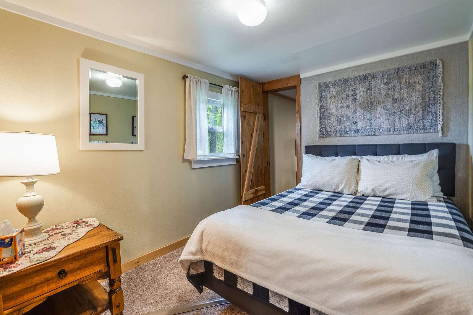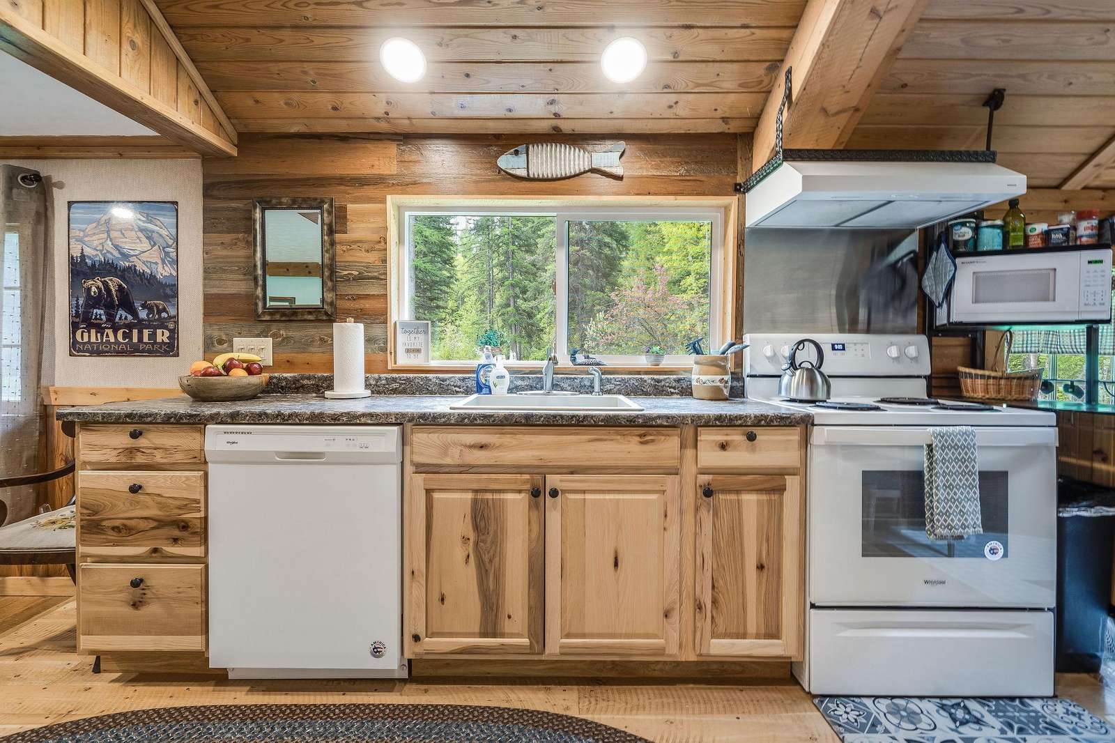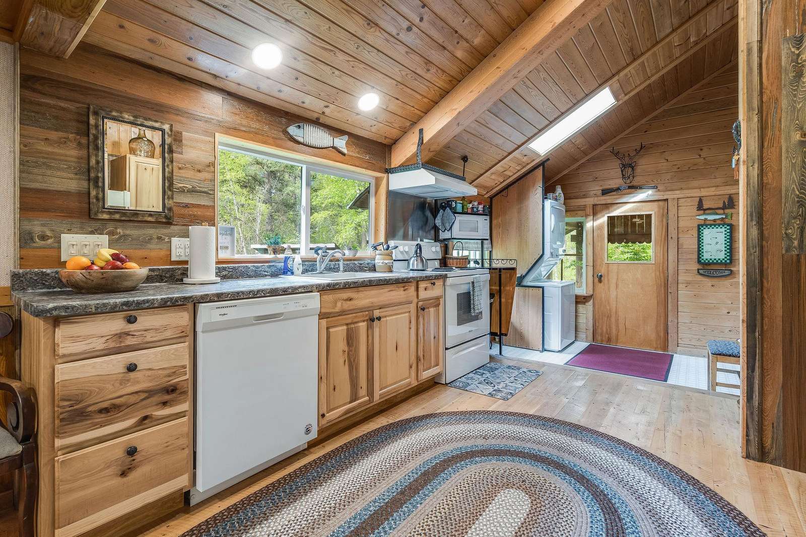 Quin has a master bedroom with a king, a second bedroom with a full bed and one small bonus room next to the master with a single bed. The cabin has one full bath, and full laundry.