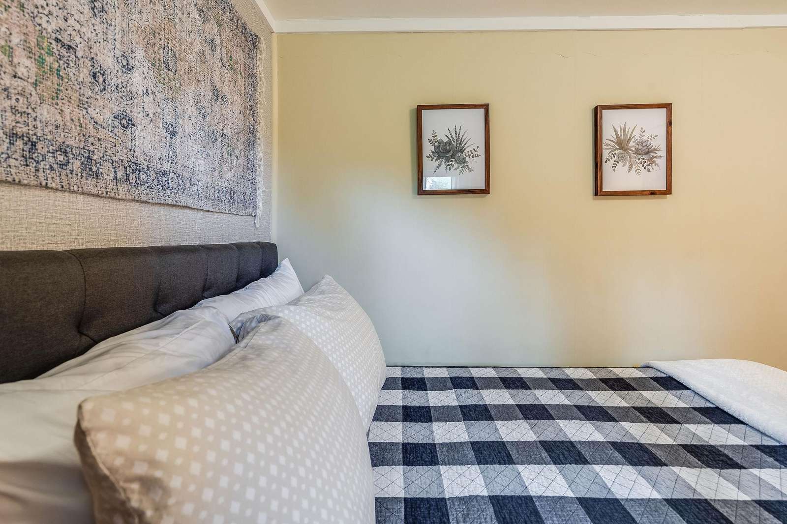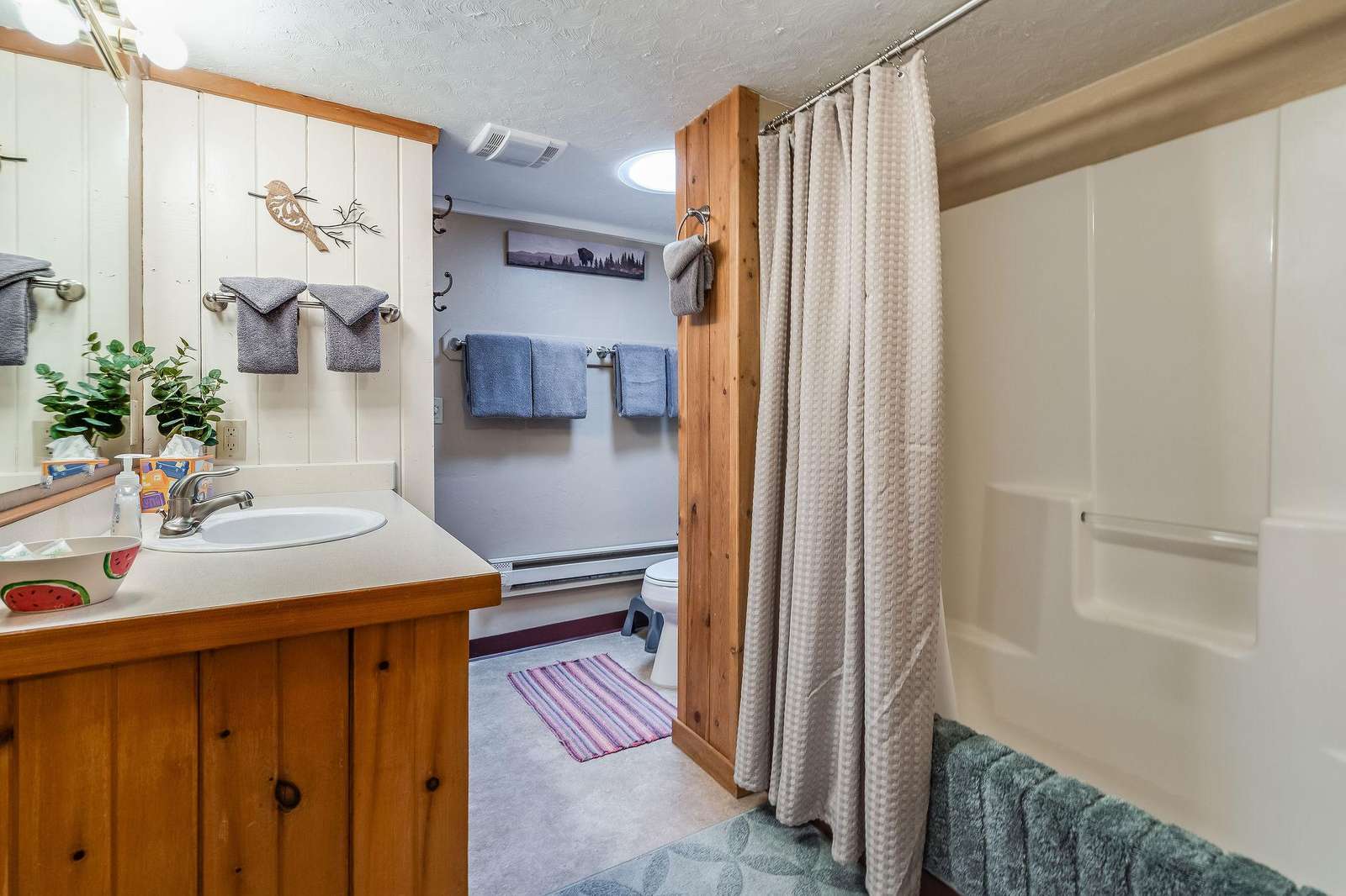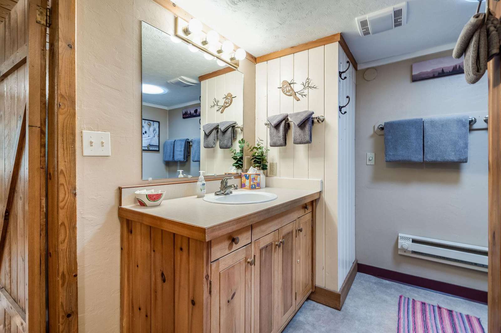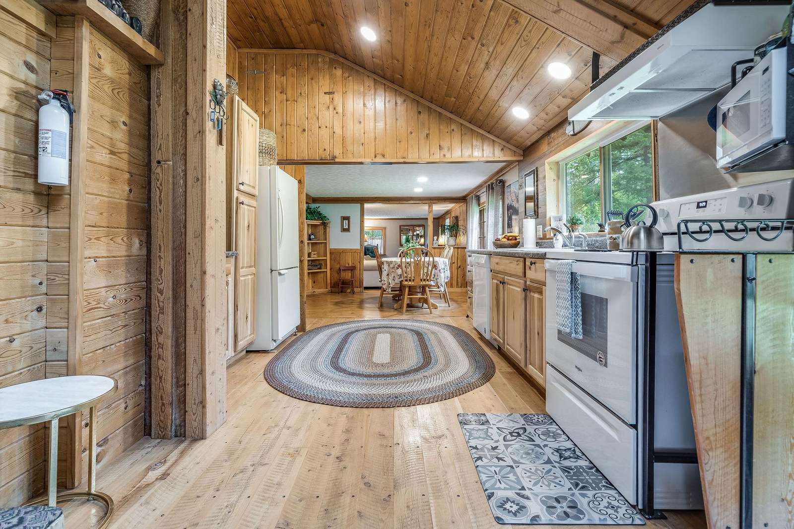 Quin has a master bedroom with a king, a second bedroom with a full bed and one small bonus room next to the master with a single bed. The cabin has one full bath, and full laundry.