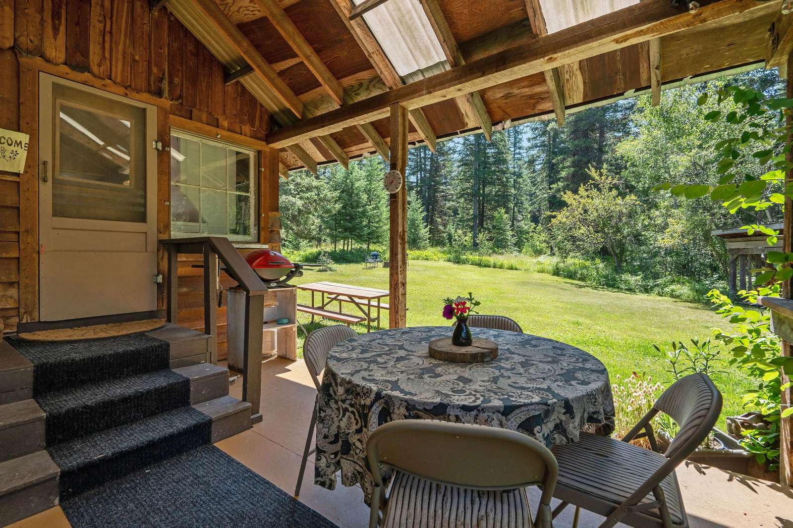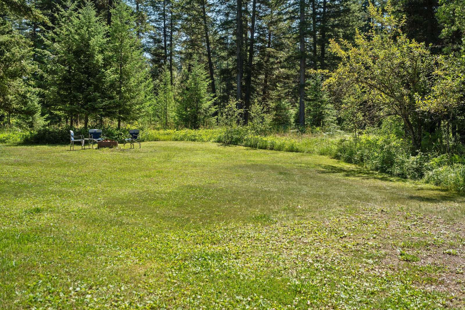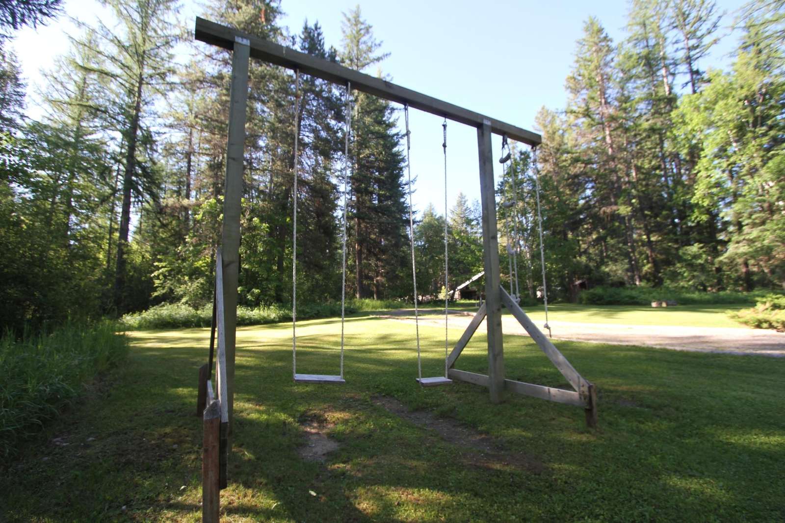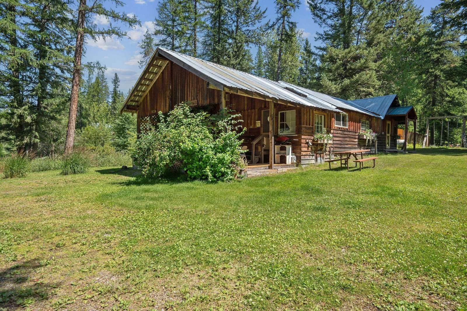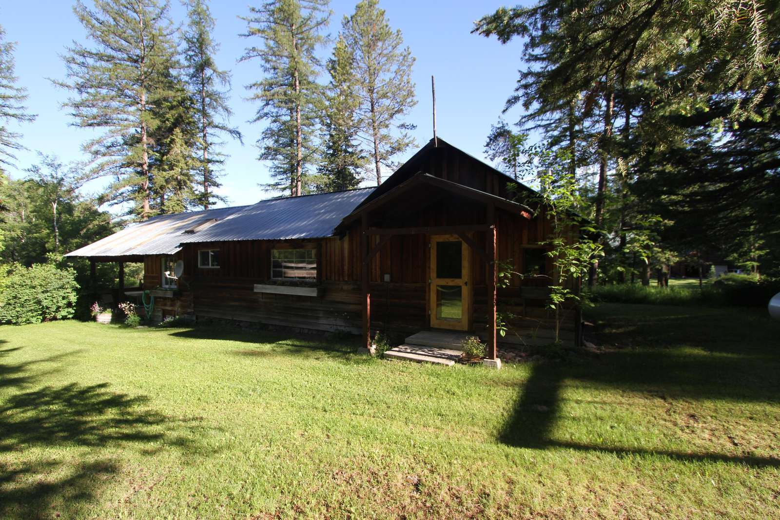 Located on North Abbott Creek on the edge of a meadow, this is one of our most private places. The house was built by our father Red Foley, for mill workers. Our father was a lumberman and during the building of the Hungry Horse Dam one of his camps was called Quintonken.